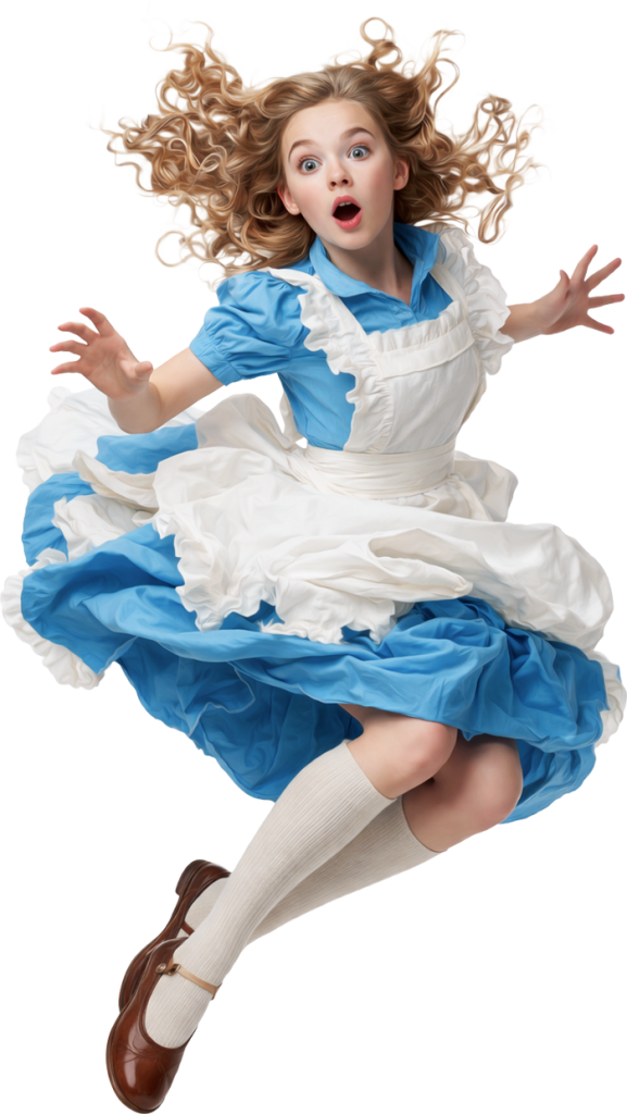CAÍA SIN TOCAR EL SUELO, COMO SI EL TIEMPO HUBIERA OLVIDADO AVANZAR. ALICIA PENSÓ QUE TAL VEZ EL MUNDO, VISTO DESDE ABAJO, TENÍA MÁS PREGUNTAS QUE RESPUESTAS.